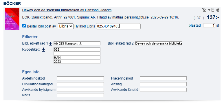 Under "Etiketter" kan du hämta information ifrån Libris till den bibliografiska etiketten (2 rader: Klassning, Huvuduppslag och Titel/Utgivningsår). Du kan också fritt fylla i vad du vill ska stå här.