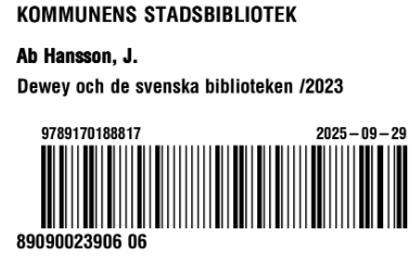 Streckkod enligt Plessey standard och bibliografisk information som fylls i vid beställningen